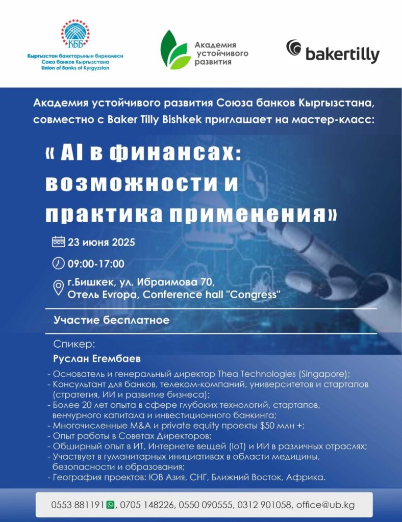 Академия устойчивого развития Союза банков Кыргызстана, совместно с Baker Tilly Bishkek приглашает сотрудников банков, МФО и страховых компаний на интенсивный мастер-класс, чтобы разобраться, как искусственный интеллект и языковые модели (LLM) уже сегодня трансформируют финансовую отрасль.